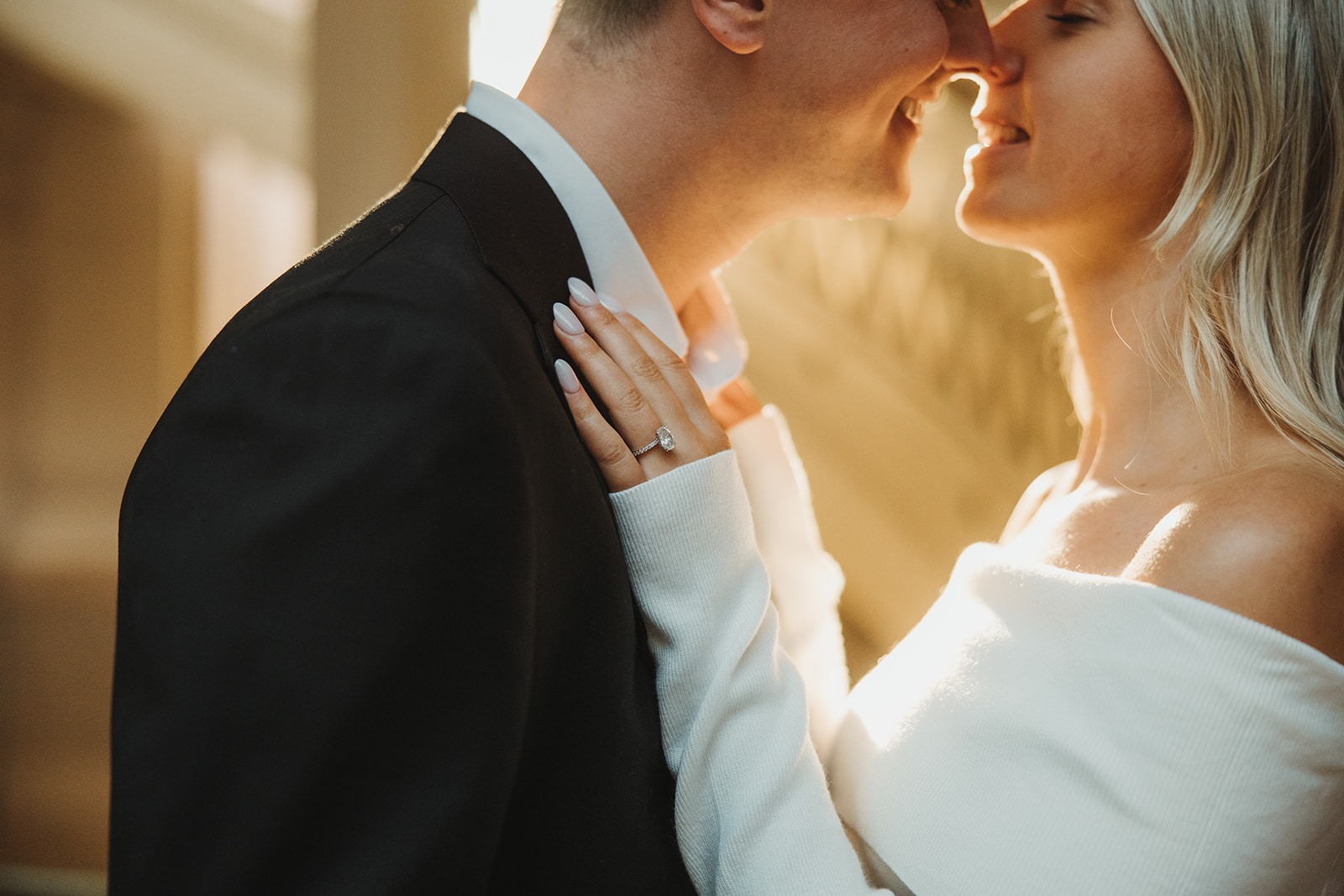 Something to know about planning your engagement photoshoot at Hartford City Hall is that a photography permit is required in advance. The permit covers the length of time for your photoshoot. With Meghan and Dave, I timed their session in alignment with the sunset. As the sun began to set, the main hall was awash with a golden glow. All in all, this effect added an unparalleled level of romance and whimsy to their images.