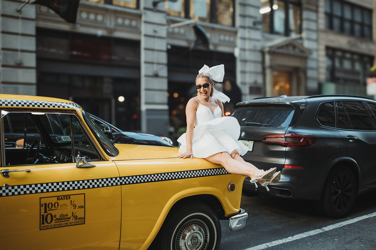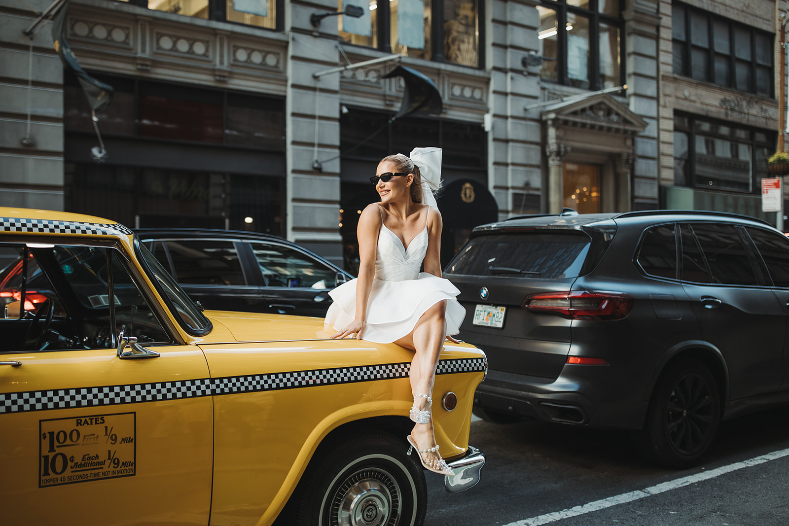 Past the doors, beyond the red carpet, a vintage yellow taxicab with ‘Hayley Paige’ emblazoned across the rear windshield awaited. Alongside it was a flourish of models donning Hayley Paige signature wedding dresses. And nestled among the gaiety was Hayley herself. She dressed for the evening in a layered mini dress that closely resembled her bridal ballgowns. Topping off her look was a flouncy, oversized bow adorning her blonde locks.