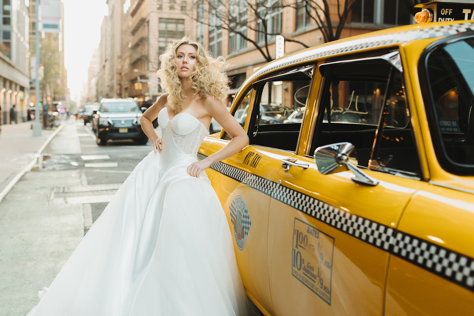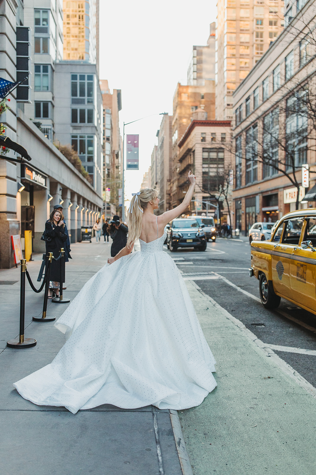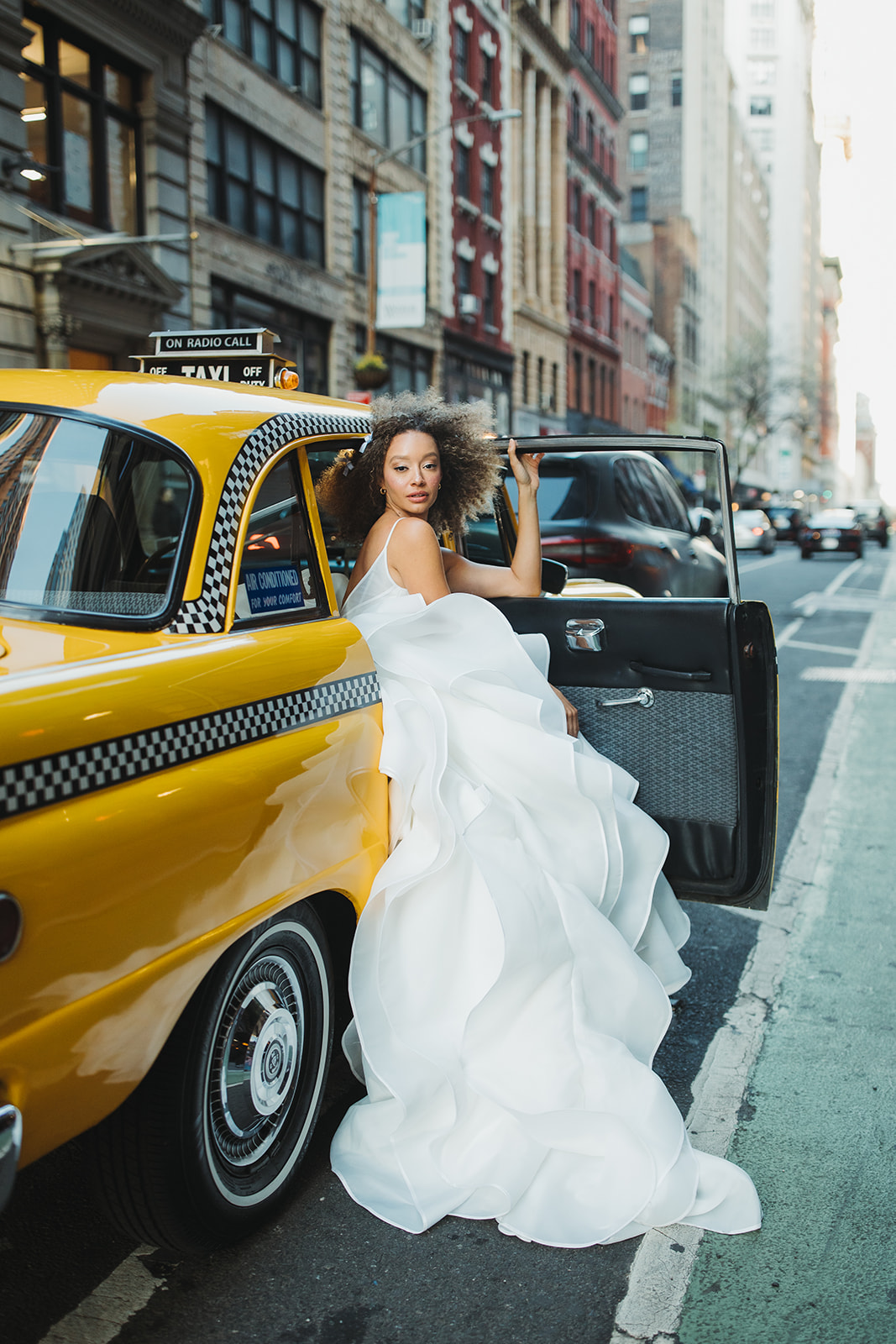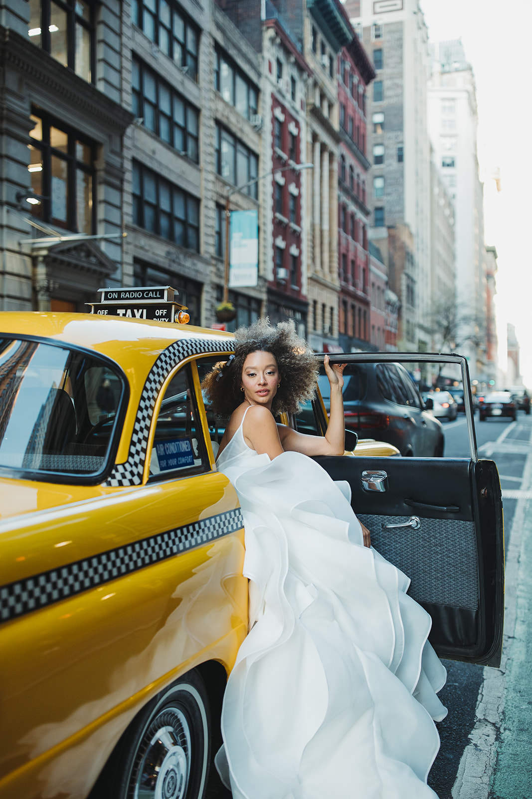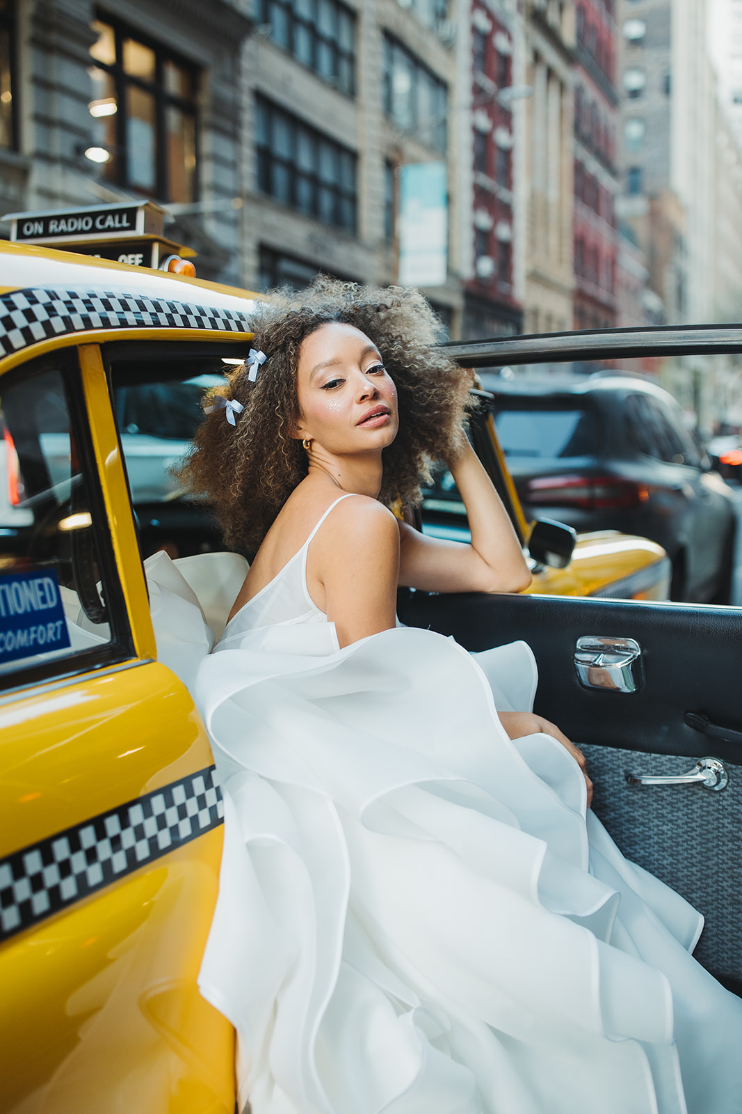 There’s something to be said about a woman hailing a cab in a well-structured wedding gown. The fairytale of a wedding day gives way to the necessity of everyday life. Thus creating an expressive moment where artistry meets demand, allowing you to step inside a new kind of story. Very representative, I suppose, of Hayley’s much-awaited and highly embraced return to the bridal industry.