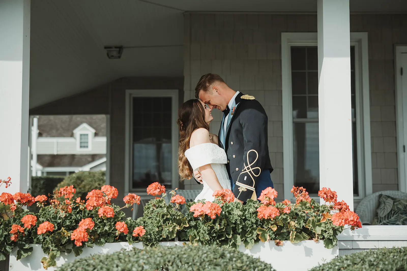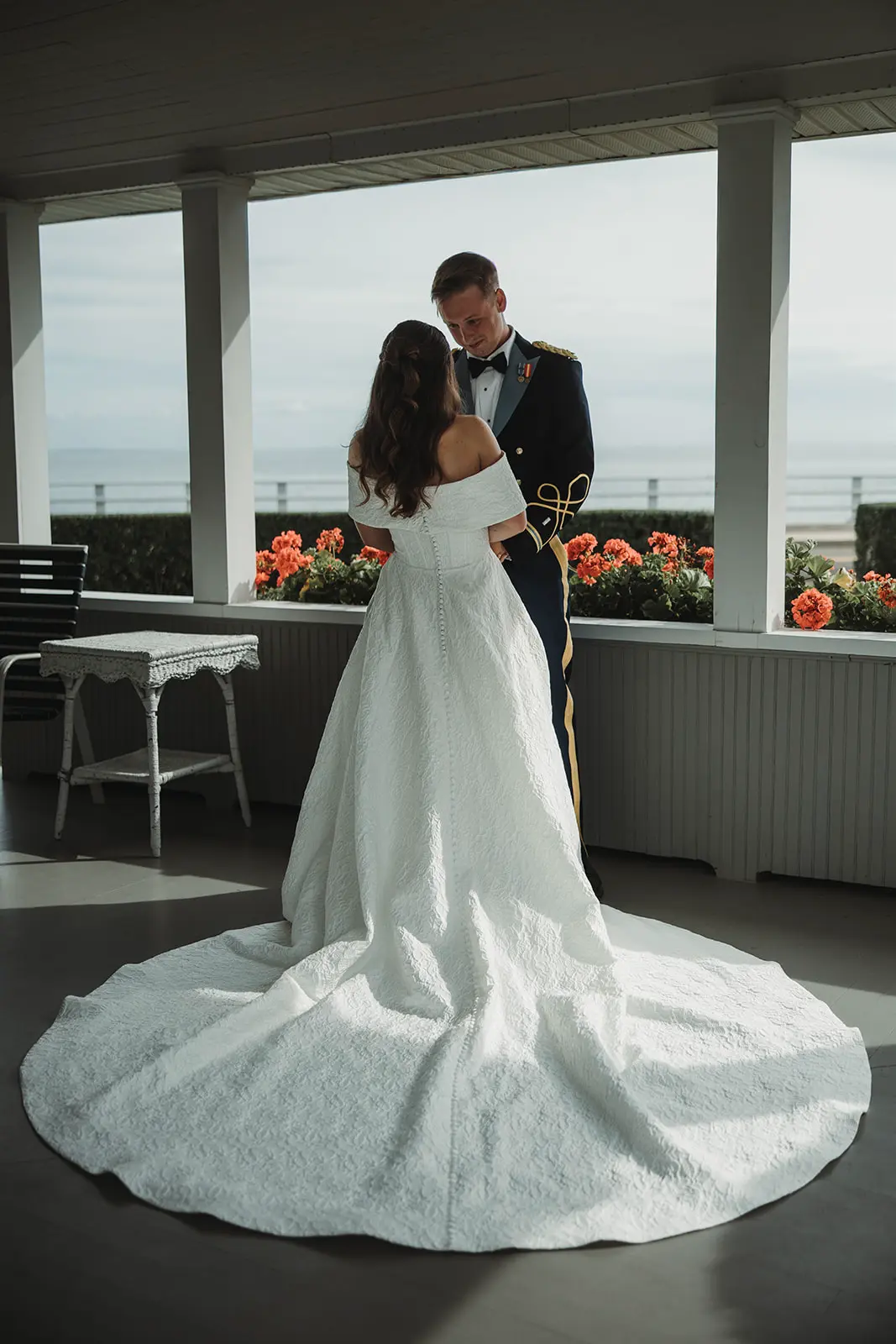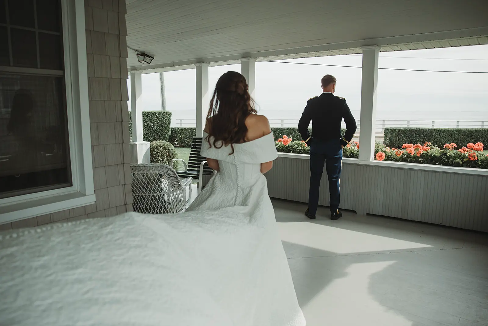 There, on the wrap-around porch, accented by abundant flower beds, with a clear view of the sea, she and Karl exchanged a first look and private wedding vows.