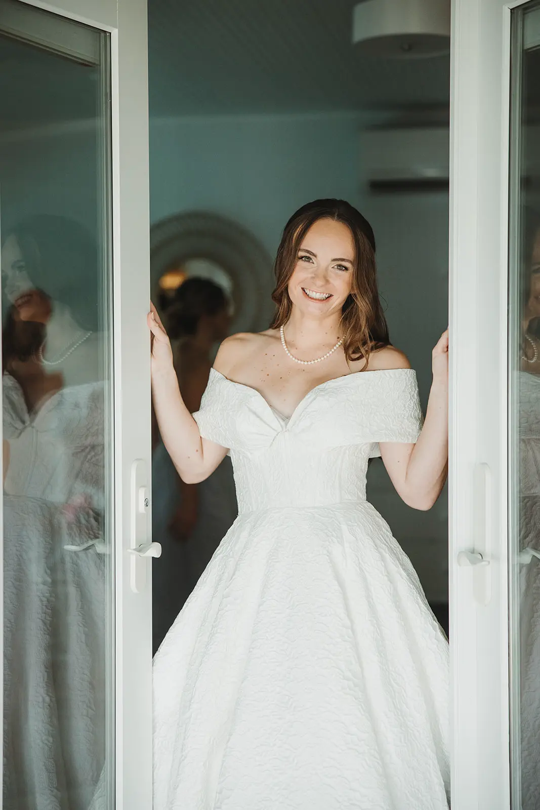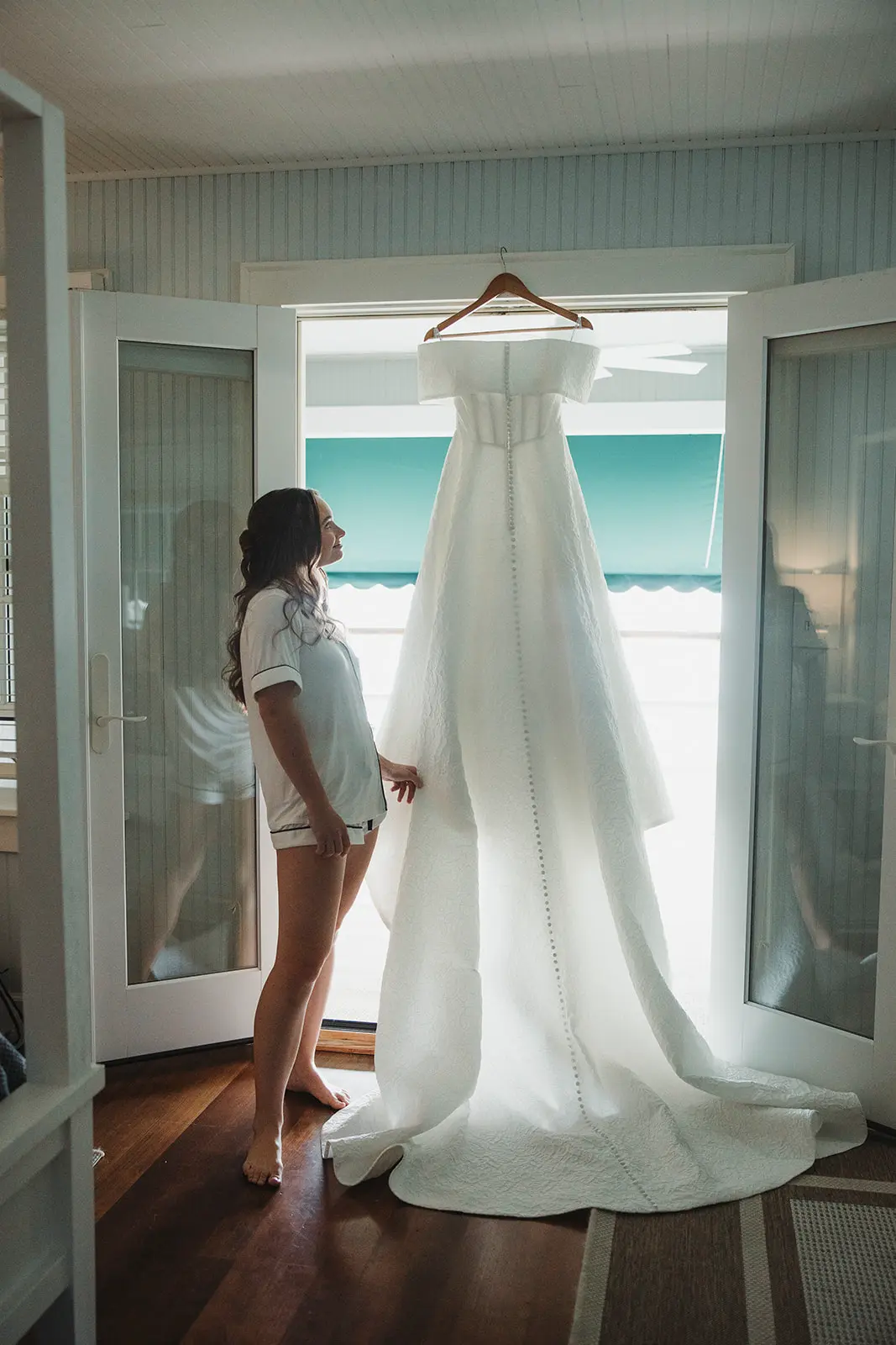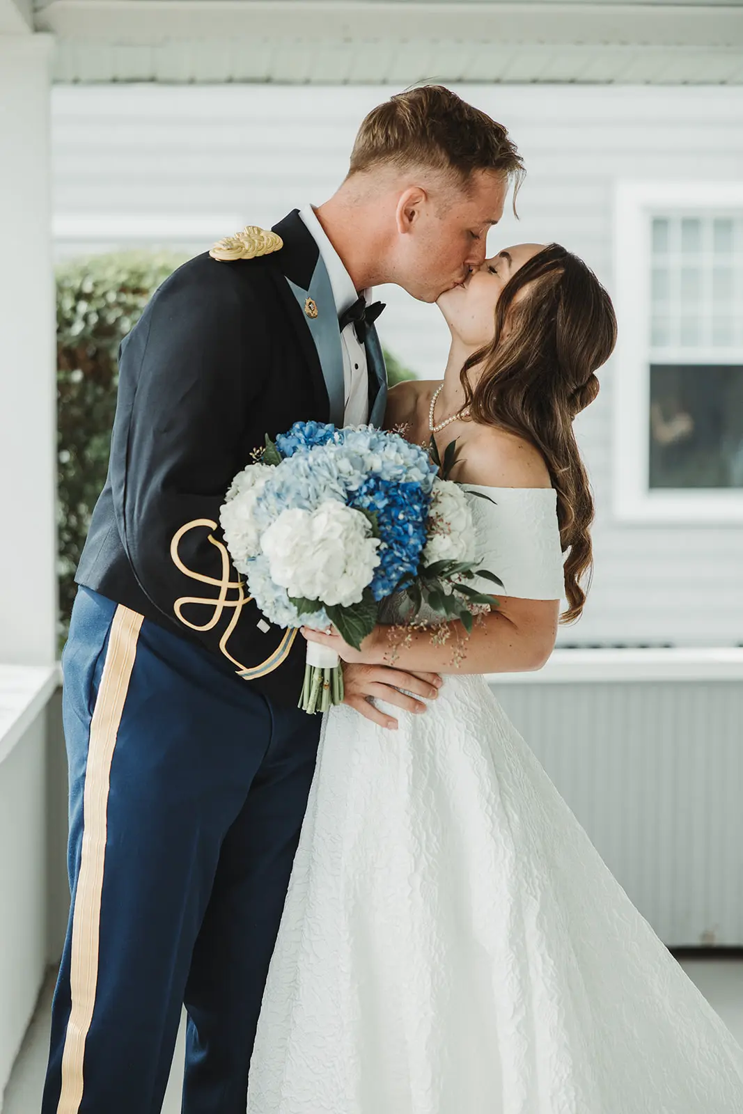 There, on the wrap-around porch, accented by abundant flower beds, with a clear view of the sea, she and Karl exchanged a first look and private wedding vows.