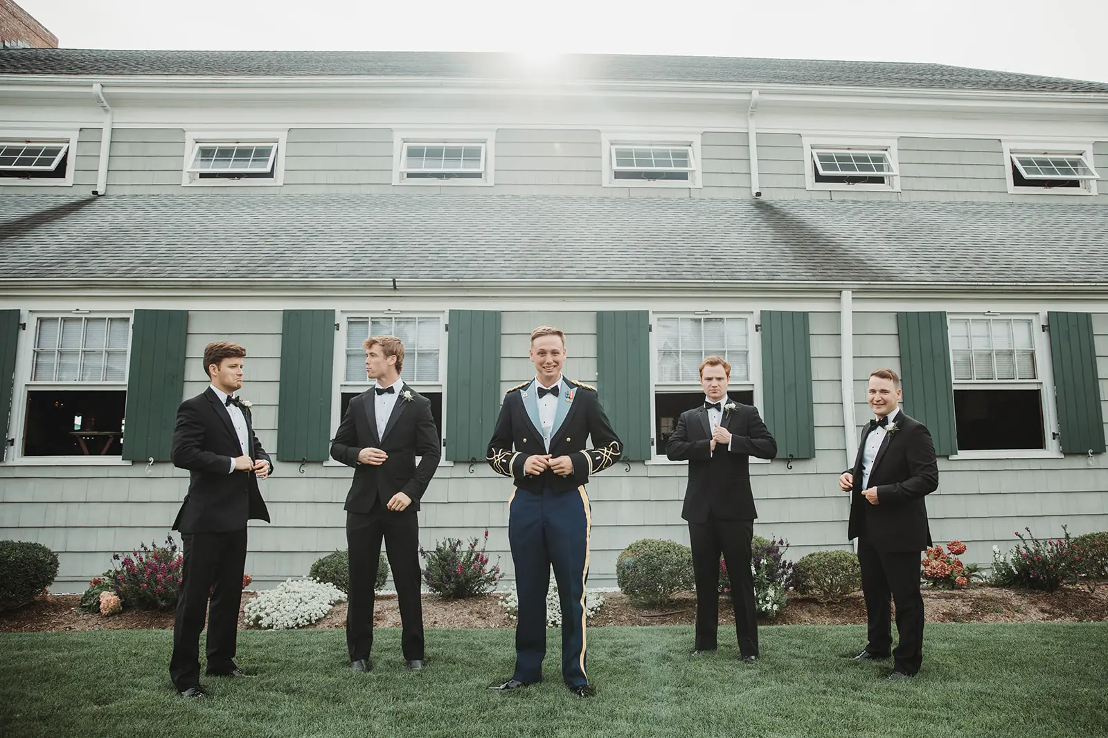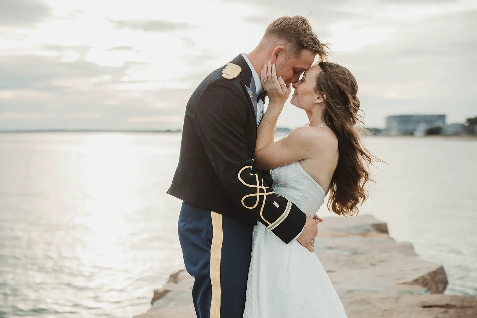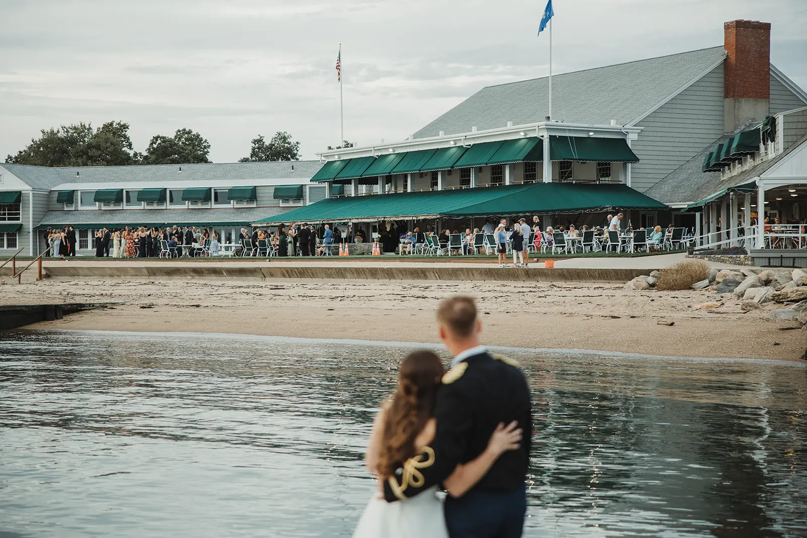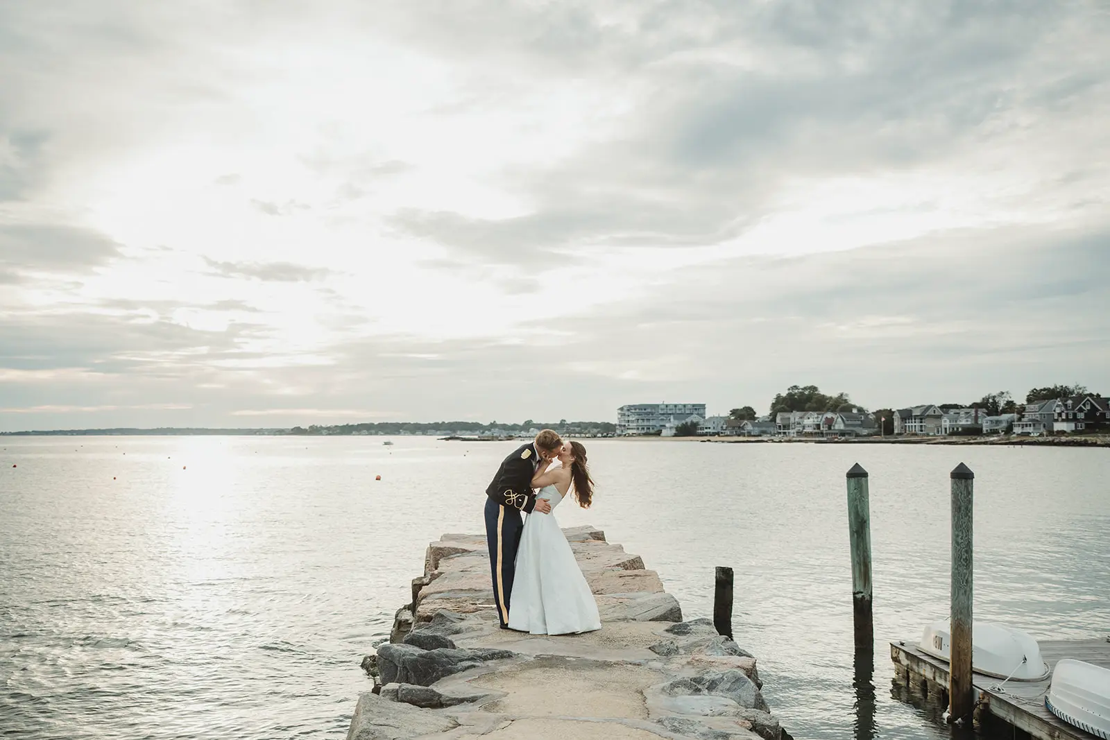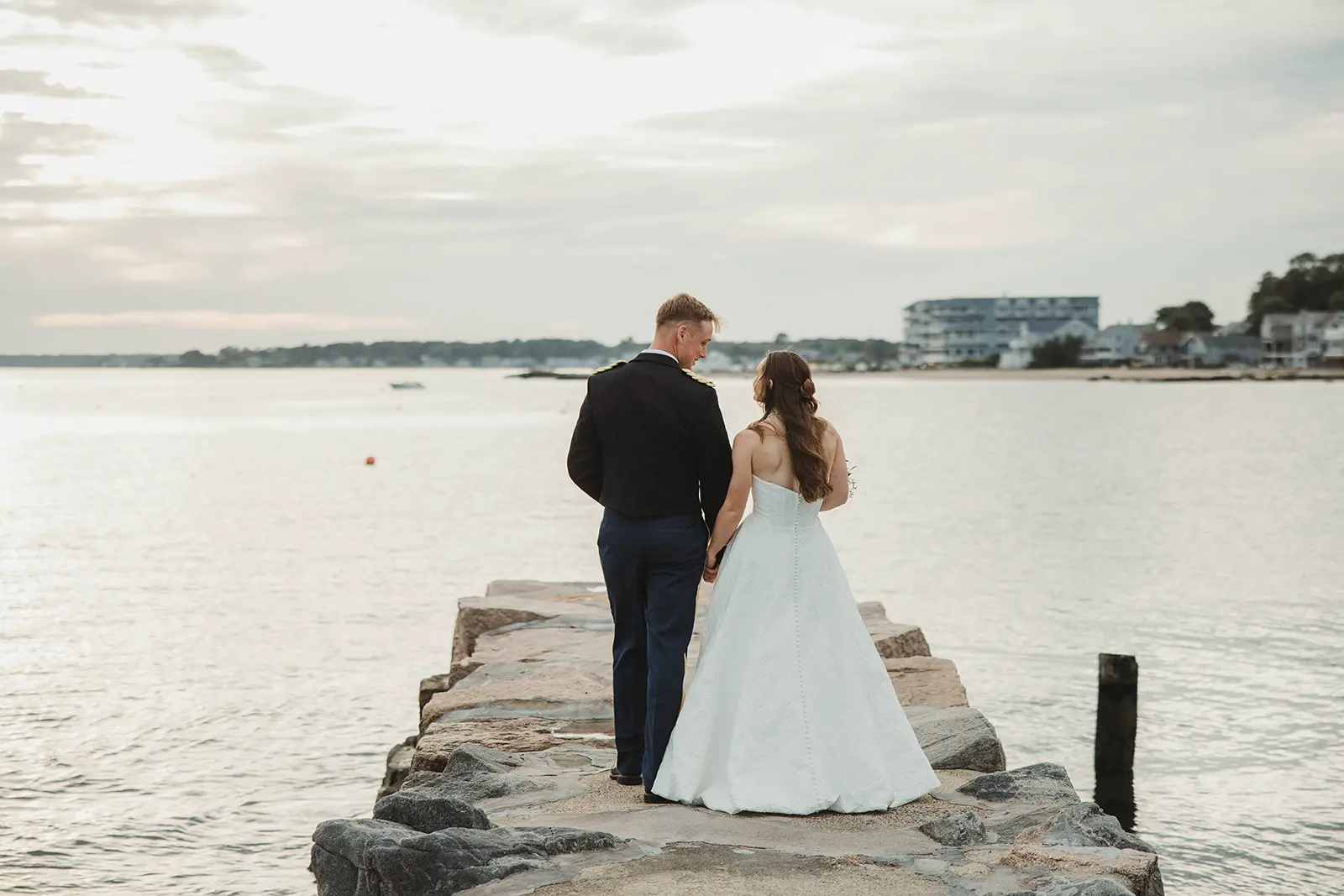 Following their wedding ceremony, a cocktail hour, complete with the firing of a canon, awaited the newlyweds and their guests. But, with the sun quickly setting off in the distance, it was time to capture wedding photos along the pier. The venue provides a clear path from the lawn to the harbor. Including a jagged stretch of flat rocks that jut out into the water. With the glow of the sun over the sea, I worked with Elizabeth & Karl to capture Madison Beach Club wedding photos bathed in coastal scenery.