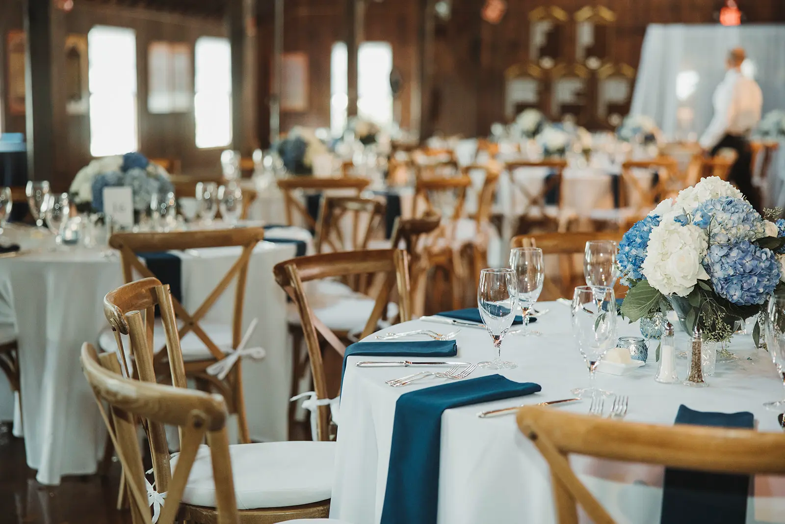 Elizabeth & Karl worked with their planner Raquel from RS Events Co to transform the space, using a color palette of pastel blue and white. Lush white roses and bountiful hydrangeas were set in floral arrangements, all in all enhancing the venue space.