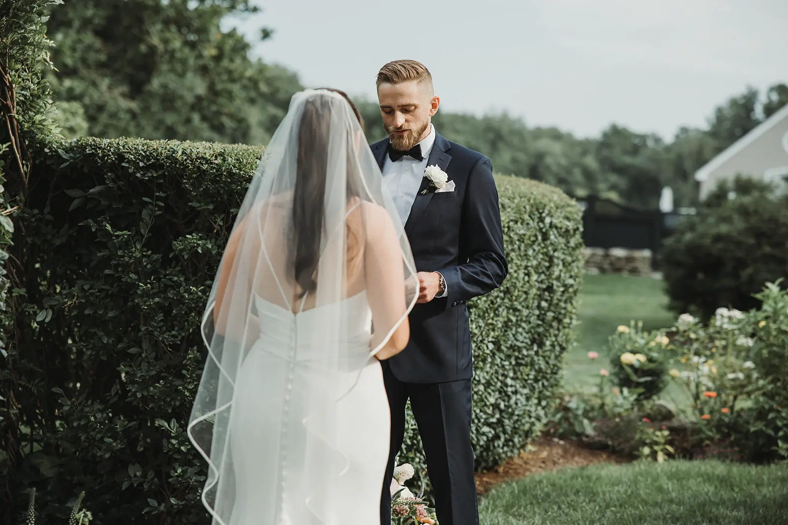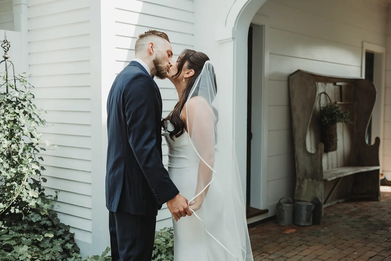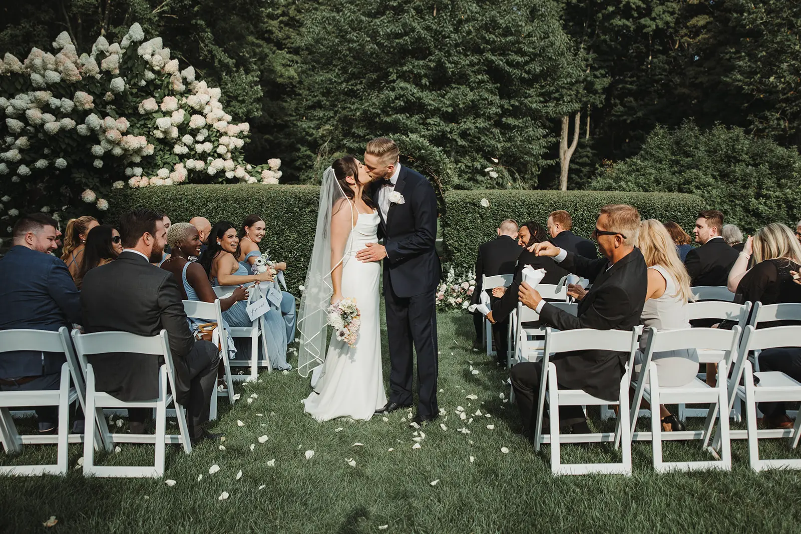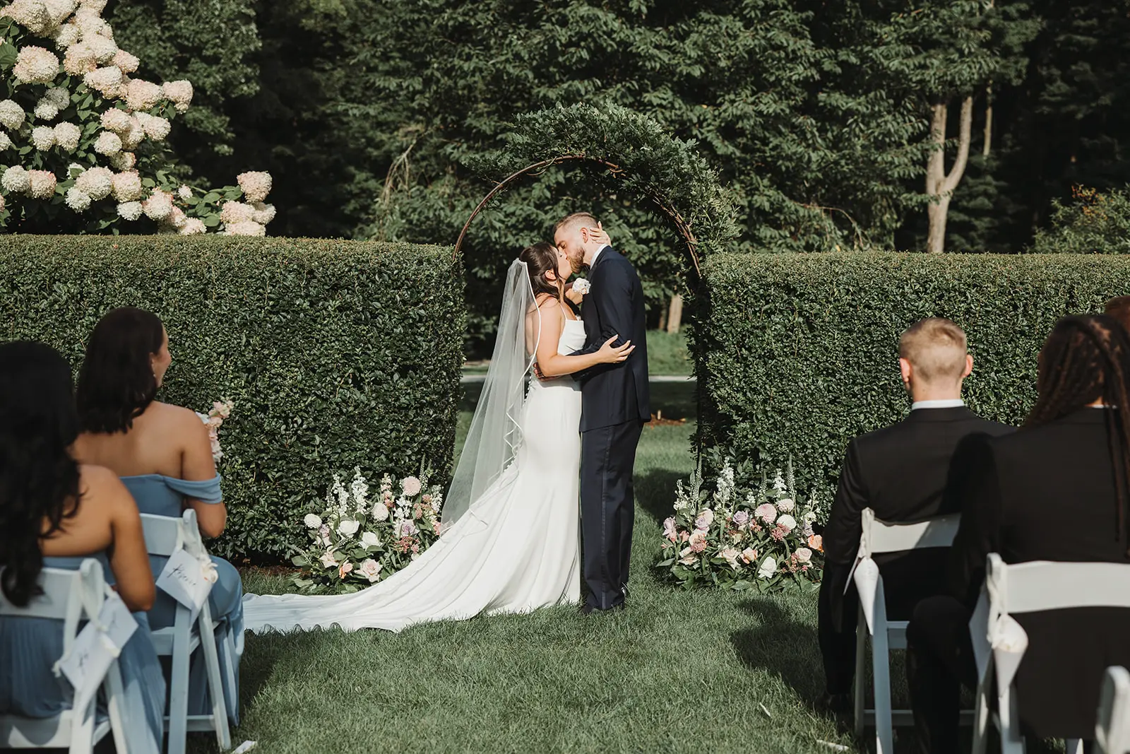 Undeniably, the backdrop of Smith Farm Gardens is unlike any other, creating wedding photos filled with oversized blooms of hydrangea, lush topiaries, and towering trees with light teeming through the oversized branches. Once Jessica and Joe were pronounced married, we explored the grounds together, capturing wedding photos that call forth the charm and splendor of a garden wedding during the summer in East Haddam, Connecticut.