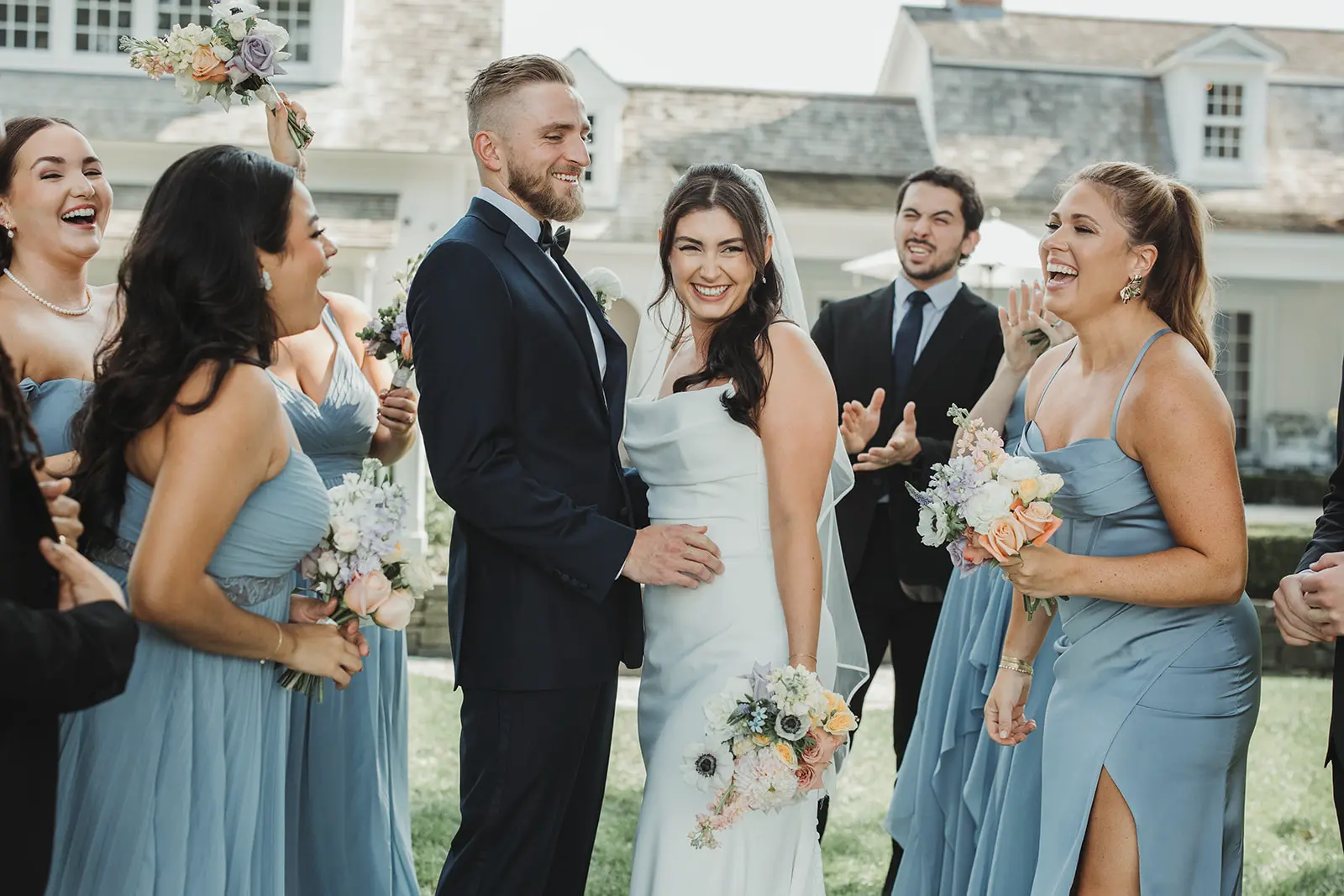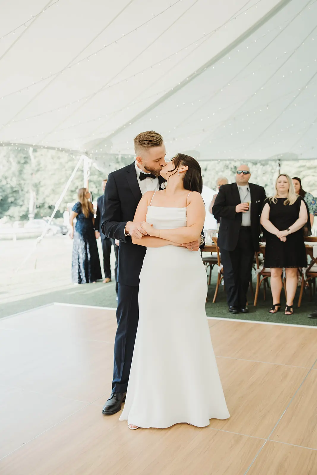 Their tented reception, celebration with dinner and dancing awaited, and it was time for them to make their grand arrival. Jessica and Joe immediately took to the dance floor as their guests cheered and applauded their arrival.